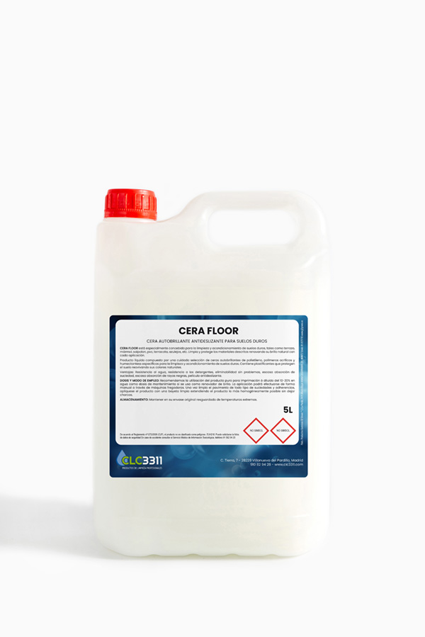 CERA FLOOR está especialmente concebida para la limpieza y acondicionamiento de suelos duros, tales como terrazo, mármol, saipolan, pvc, terracota, azulejos, etc. Limpia y protege los materiales descritos renovando su brillo natural con cada aplicación.
