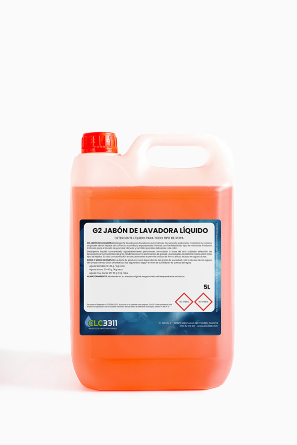 G2 JABÓN DE LAVADORA Detergente liquido para lavadoras automáticas. No necesita prelavado, mantiene los colores originales de los tejidos así como su suavidad y esponjosidad. Elimina con facilidad todo tipo de manchas. Producto indicado para el lavado de prendas blancas y también prendas delicadas y de color.